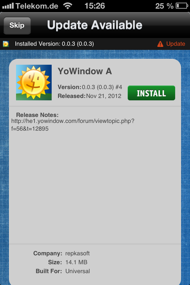 With Version 0.1.1 on the iPad 3 its only "Loading YoWindow, since 5minutes.