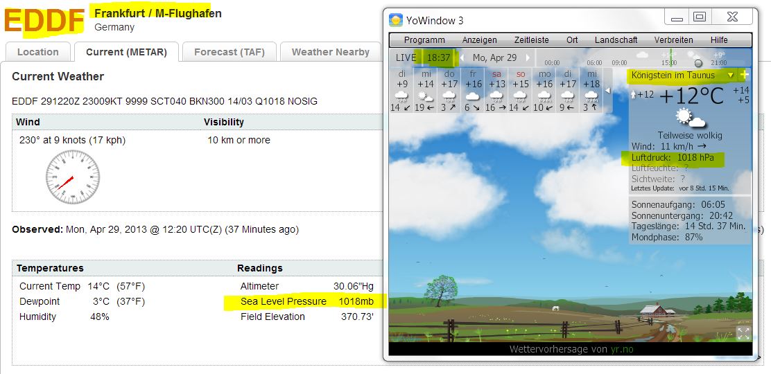 It is not a "LIVE" situation with the correct air pressure data for the selected location. Only when the METAR station and the location are at the same altitude, values ​​are correct.