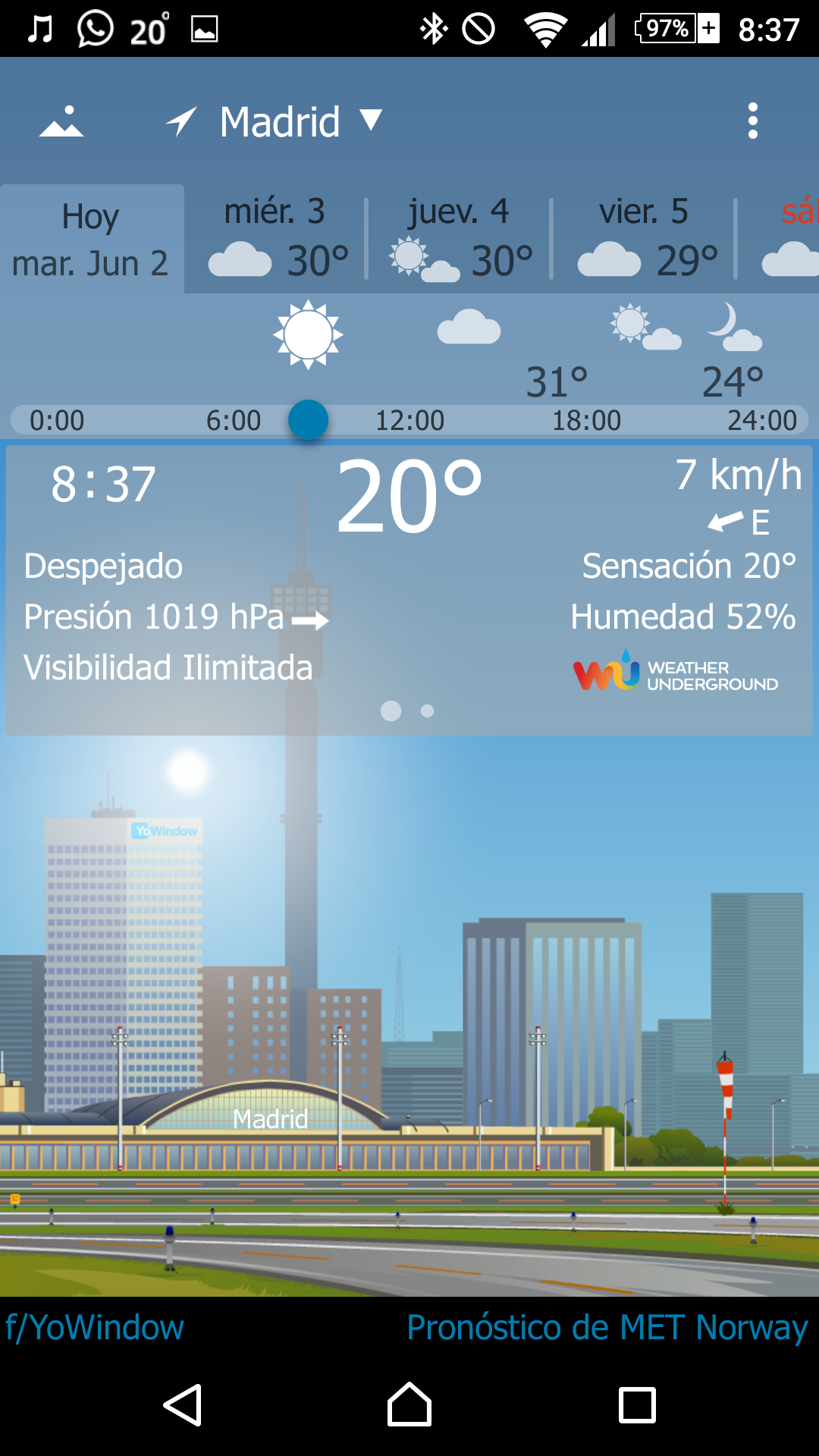 android use weather underground, but from the position where I am in moratalaz tell me the application that I am in Madrid (attached screenshot) and provides data station Cuatro Vientos but in the original application of Weather Underground gives me as San Blas nearest geonames 6544488 and it is true that there is a weather station there, taking advantage of the occasion if you can help me how to connect my windows 7 weather stations that I have connected to weather underground ... so I can see my own stations from I window ....