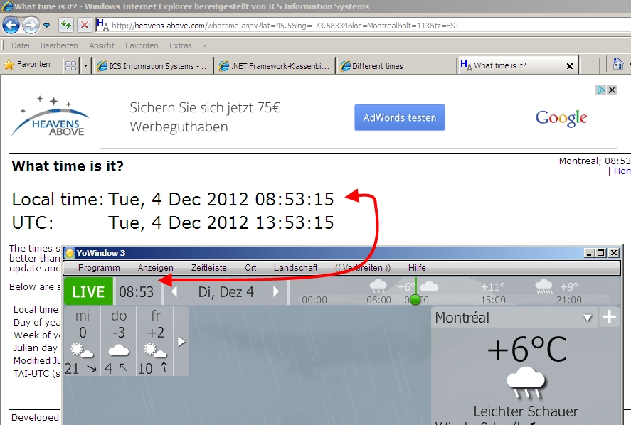 i'm sorry but i can't reproduce the time-shift. When i set the location to Montreal in the desktop-edition i get the correct time as the "LIVE"-time. I checked with "heavens-above.com" (the window in the background of the following screenshot):