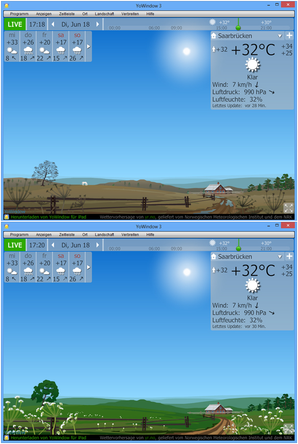 mein Problem: die Ansicht des Programms stimmt nicht mit der Ansicht im Bildschimschoner überein. Aktuell im Programm 'Sommer' im Bildschirmschoner aber nackiger Frühling oder so. Keine grünen Wiesen, Baum nicht belaubt etc.
