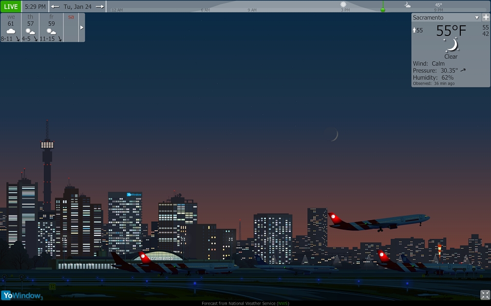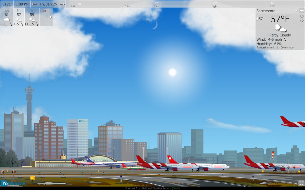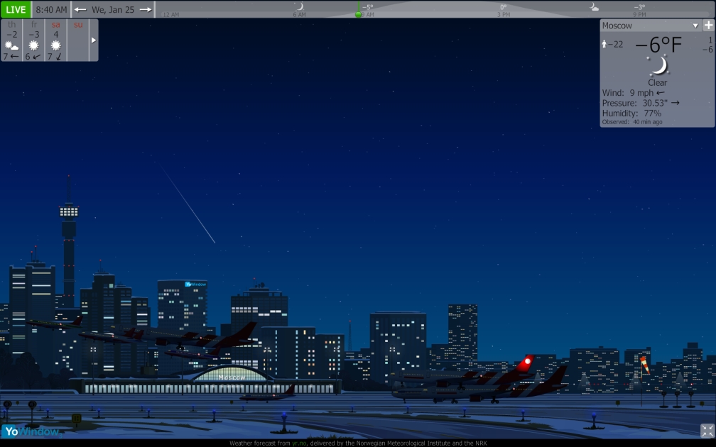 When I switch between two locations using the airport landscape, any airplane on the runway or landing or taking off stops where it is and stays there. You can make them go away by minimizing then maximizing YoWindow.