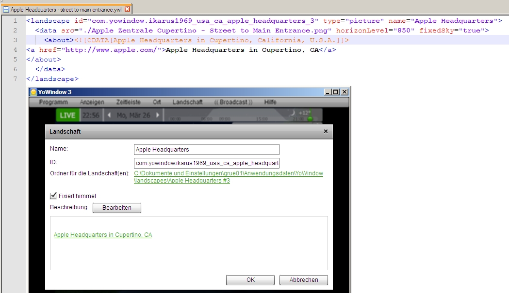I am not sure about the format. I have one landscape and want to include a link. So i opened my editor, coded a "<![CDATA[" section with the text (close it with "]]>") and appended my link (html-format) but when i add this landscape to YoWindow and open the landscape properties i do not see the complete description. Furthermore when i press the button to edit the description within YoWindow i get the complete "<about>"-tag section.