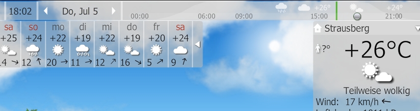 In meinem Beispiel habe ich -offensichtlich leider vergeblich- versucht, die reale Darstellung von Yowindow darzustellen. Das Beispiel zeigt NICHT den ganzen Tag Sonne, sondern den Wechsel zwischen 2 unterschiedlichen Wetterformen, nämlich "teilweise wolkig" und "klar"!